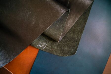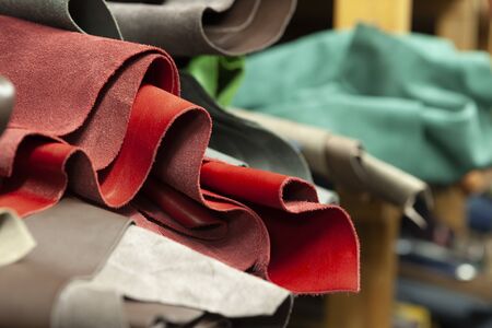 Different pieces of leather in a rolls. The pieces of the colored leathers. Rolls of natural brown and black and other leather. Raw materials for manufacture of bags, shoes, clothing and accessories.