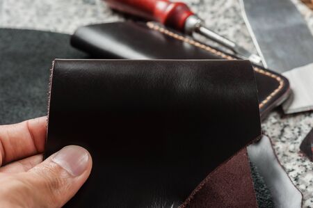 Leather accessories, craftsmanship and small business concepts. Close up of male hands holding luxury handmade leather wallets of different colores on table with crafting tools