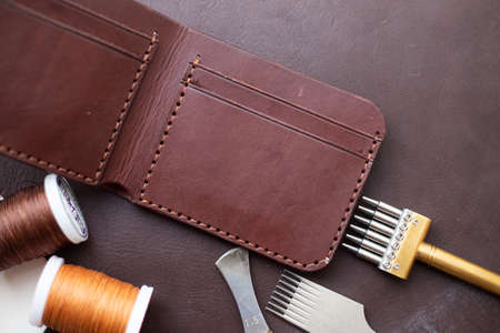 Leather card wallet handmade with thread and leather tool object craftsmanship working