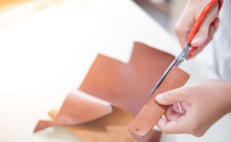 Female hand cutting the leather plate with pattern standard size, The leather for tag or keychain.