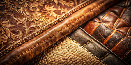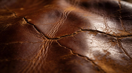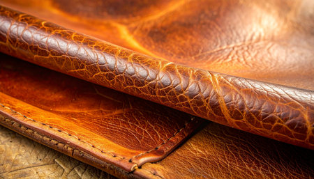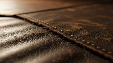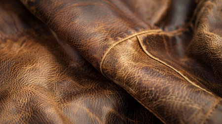 A close-up view reveals the intricate texture and rich color of brown leather, highlighting its beautiful stitching and natural imperfections, illuminated by soft lighting.
