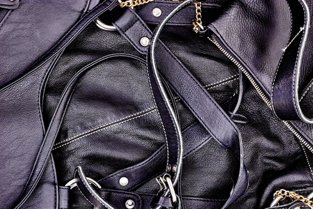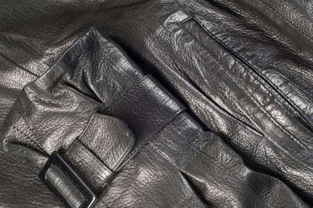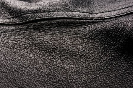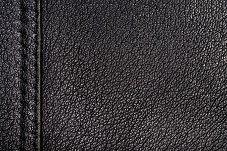 Texture of a surface from a natural skin of black color with single seam with double stitch in left side. Close-up view.