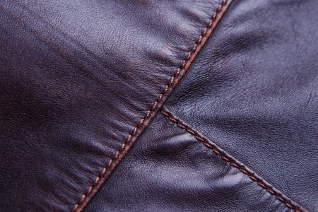 Close up view of worn dark brown leather texture highlighting detailed machine stitching