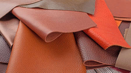 Sample of leather textile brown colors, background. Catalog and swatch tone of Interior fabric for furniture, closeup. Collection of multicolored cloth with skin pattern, macro.