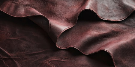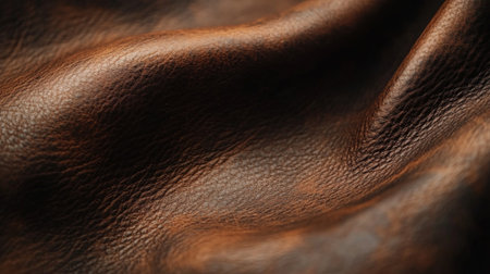 Detailed macro shot of smooth brown leather fabric with natural grains and subtle folds, showing its premium quality and warmth.