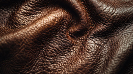 Detailed macro of wrinkled brown leather fabric, showing its rich, textured surface with natural grains and a luxurious finish.