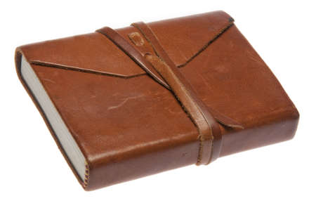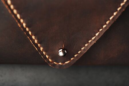 The leather cover of the album is made of brown handmade genuine leather on a black background. Elements of a leather product close-up. Craft, low contrast