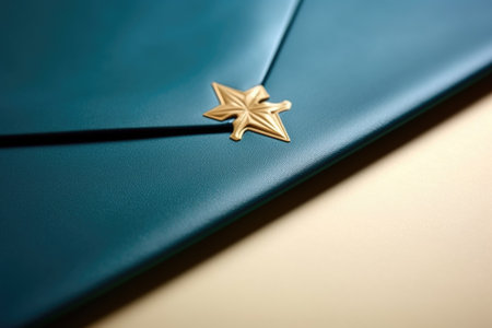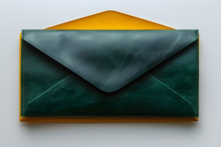 Stylish dark green leather envelope positioned on a contrasting golden background. perfect for formal invitations, notes, and professional correspondence, luxury and sophistication with its sleek design and color contrast. Generative AI