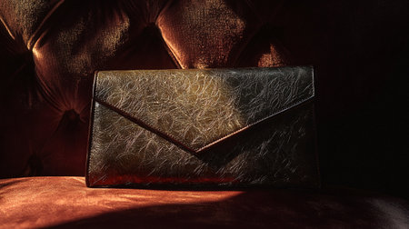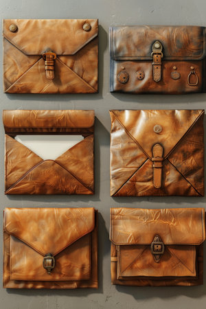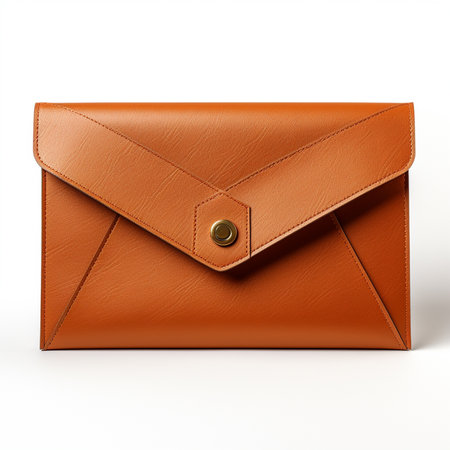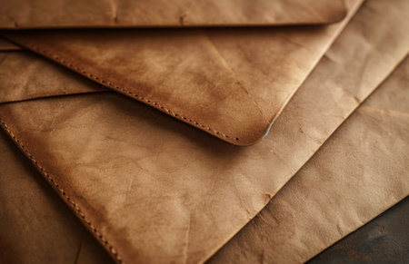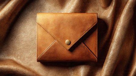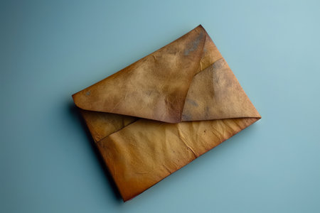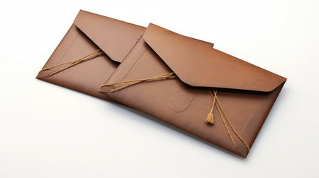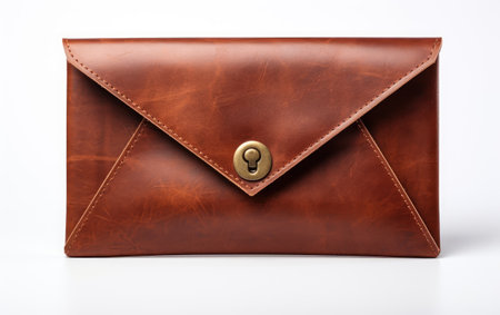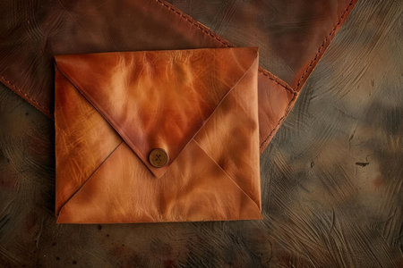 Top view of a stylish brown leather envelope, evoking classic correspondence aesthetics