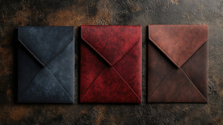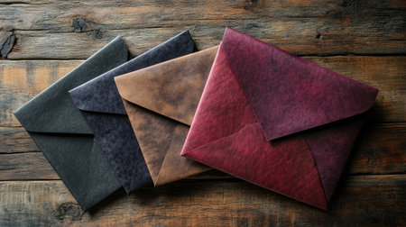 A stunning display of various envelopes in rich colors and textures arranged on a dark surface, perfect for creative projects, invitations, and stationery design inspiration.