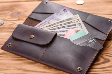 Beautiful leather brown purse made of leather to store paper money and credit cards