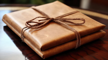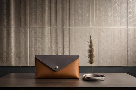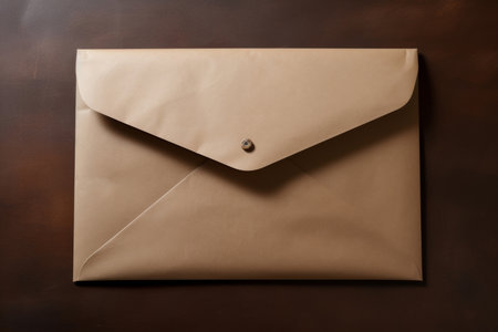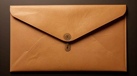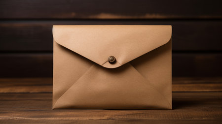 brown envelope with a small button, showcased against a brown wall background. this photo captures the essence of the american studio craft movement, with meticulous design and a focus on wood. packed with hidden details, the envelope exudes a clean-lined and multilayered aesthetic. soft lighting enhances its overall appeal. ai generated