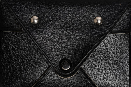 A stylish black leather envelope bag featuring silver button fastenings sits on a smooth, neutral surface, showcasing its elegant design and texture
