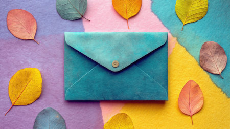A vibrant envelope rests among falling autumn leaves on a pastel background. This creative flat lay captures the essence of seasonal beauty and artistry.