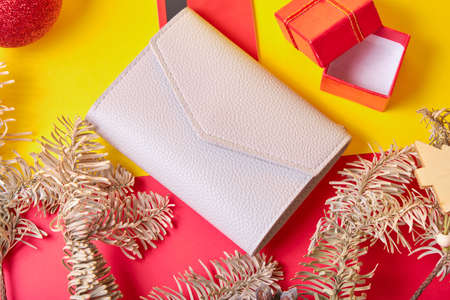 beige wallet and christmas decor on yellow red background, shopping for gifts concept, time for christmas shopping