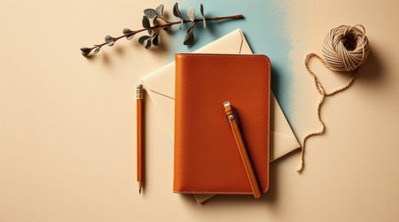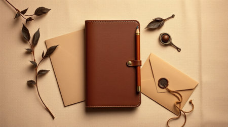 An appealing setup features a brown leather notebook, a pencil, beige envelopes, and delicate leaves. The items are arranged on a textured beige background, creating a sense of sophistication.