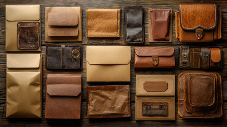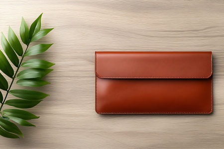 A stylish brown leather envelope placed on a wooden surface, complemented by a green leaf, showcasing a modern and minimalist aesthetic perfect for creative projects.