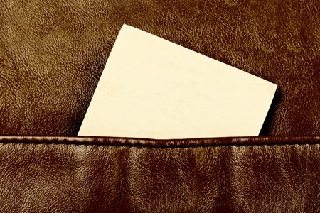 Business cards blank or bank card in a leather wallet. Mockup on wooden background. Copy space for text