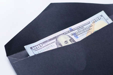 Black Envelope with money, csloe-up. Dollar money in an envelope isolated on white. Salary, earning and savings concept