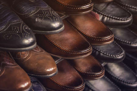 Toes of leather mens shoes on shelf. Racks of mens shoes in store, boutique, shopping mall. Mens shoes concept. Shoes fashion background.