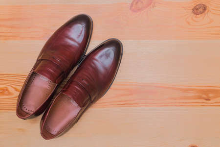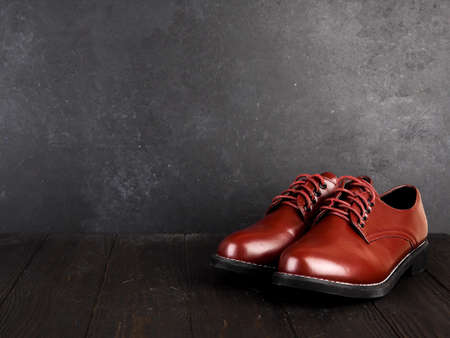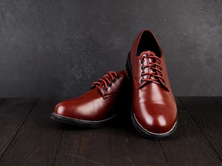 Men's shoes made of red brown natural leather stand on a wooden floor background copy space.