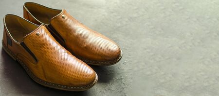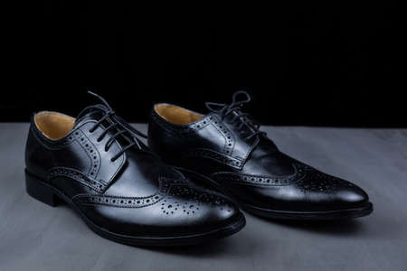 Classic men's shoes on a darck background. Angle view from the front.Close-up. Copy space.