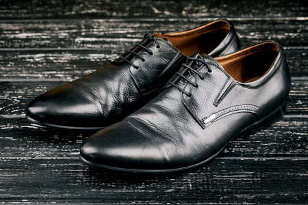 Pair of black shoes on a black background. Men's fashion shoes. Classic men's shoes made of genuine leather. Men's accessories. Elegant stylish shoes
