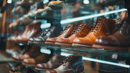 A modern retail store display featuring stylish leather shoes neatly arranged on shelves, with warm and inviting lighting creating a sophisticated atmosphere.