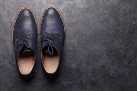 Men's classic shoes on stone background with copy space. Top view flat lay