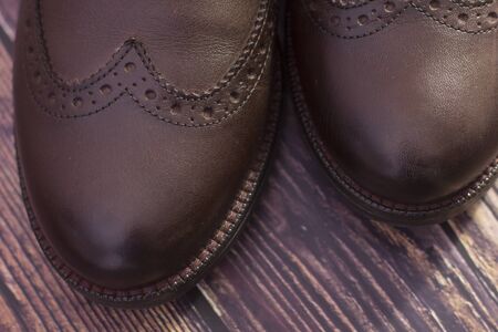 Stylish brown shoes for the groom. casual shoes on wooden background