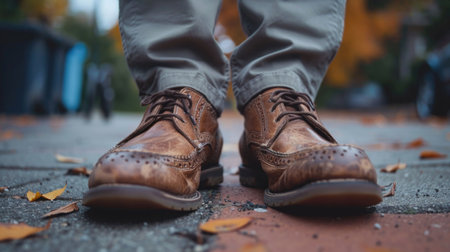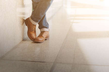 Businessman`s hand with brown leather shoes