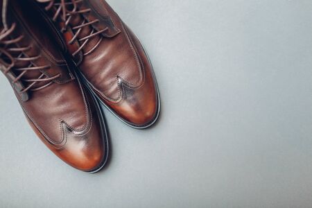 Shoes, stylish leather boots for men. Male winter, autumn or spring fashion. Brown footwear on grey background. Space