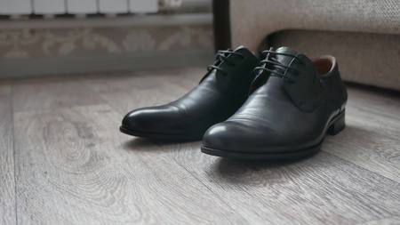 Mens black shoes on the floor. Wedding in Montenegro