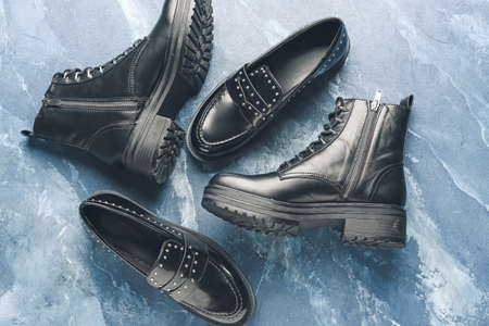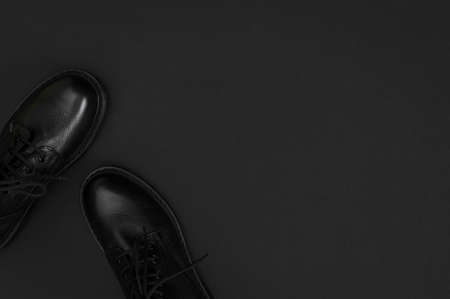 Fashionable youth black leather boots on black background flat lay top view. Stylish womens mens unisex boots. Grunge boots with bootlace. Clothes, shoes, fashion background. Classic leather shoes.