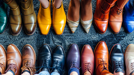 A row of mens business shoes lined up neatly, showing various styles and colors in a perfect harmony.