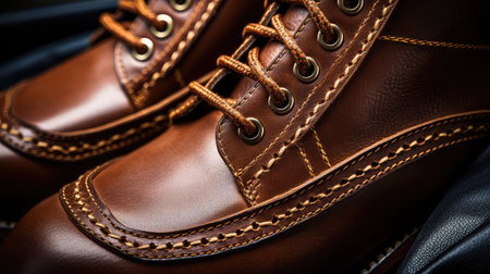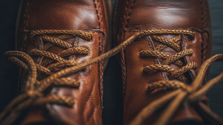 This image showcases a close-up view of brown leather shoes with intricately tied laces, set against a dark background, creating an elegant and rustic feel.