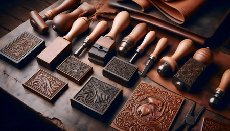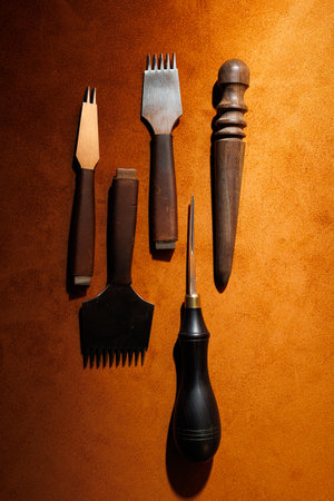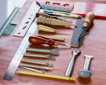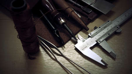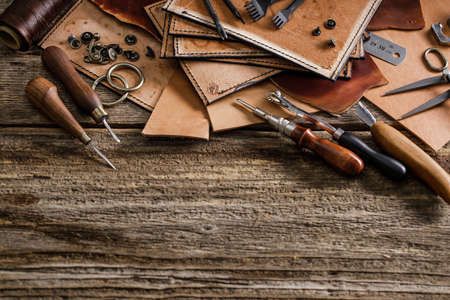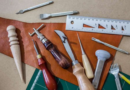 Leather crafting tools still life. Tanner's workshop. The concept of small, private business