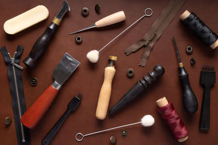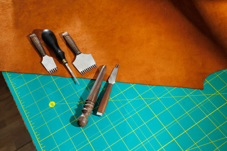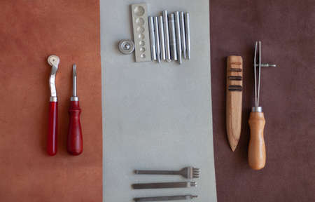 The layout of craft tools for working with leather and leather materials lie on pieces of leather. Flatlay with space for text