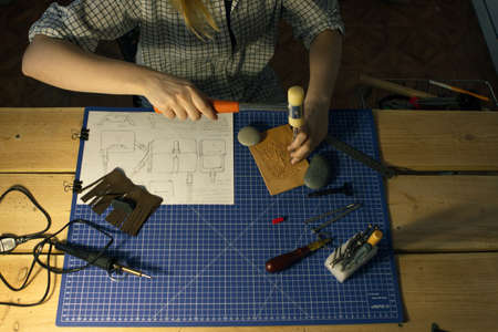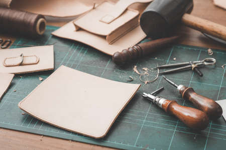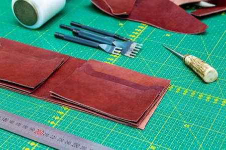 Leather craft for wallet working with tool on leather craftman's work desk .