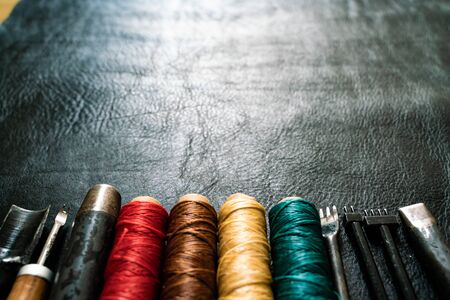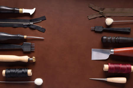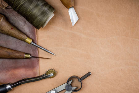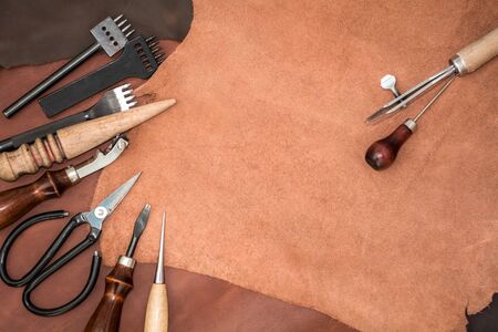 Leather craftsmanshiip with handmade tool object on leather working bckground