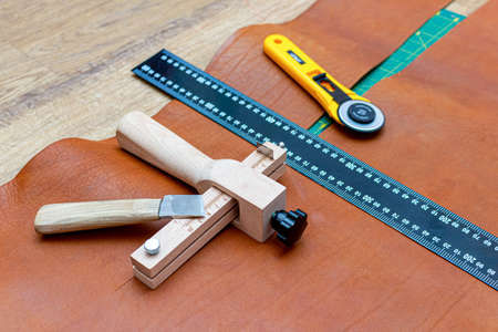 Cutting brown leather for a bag. Leather craft tools ruler stripe cutter rotary blade