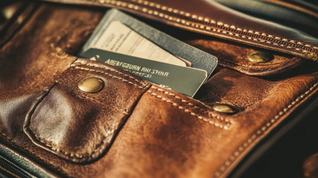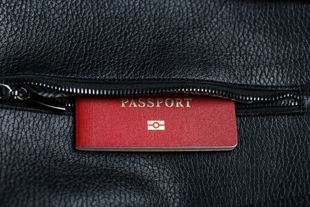 Passport looks out of the pocket of a black leather bag close-up, macro Handmade, natural materials. Design products, Hobbies, and businesses.