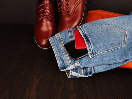 Mobile phone and passport in jeans pocket, leather shoes, travel concept.