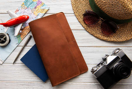 Preparation for travel,camera,hat,shoes,watch, leather bag on wooden table.