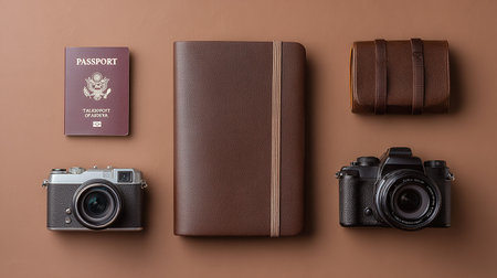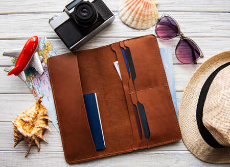 Flat lay traveler's accessories. Passport, camera, wallet and wallet on brown background