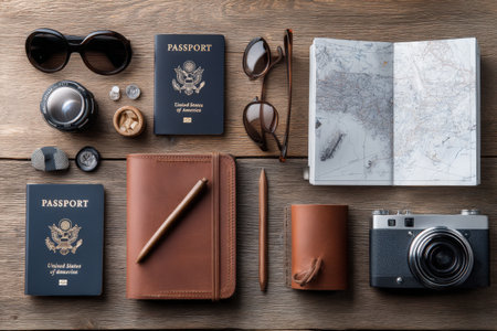 Travel essentials layout with two us passports, vintage camera, map, and sunglasses on wooden table.