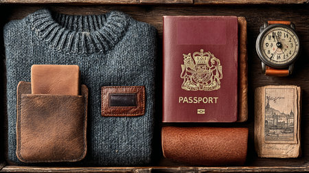 A travel essentials flat lay with passport, camera, leather wallet, notebook, and pencil arranged on wooden surface, evoking adventure and readiness