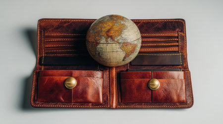 An open leather wallet with a vintage globe placed on top, representing themes of travel, adventure, and personal finance in a stylish, modern setting.