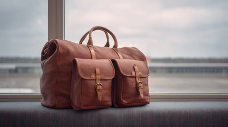 A chic leather bag with practical pockets sits on a window sill, capturing the essence of travel. Perfect for weekend trips or stylish getaways, it combines elegance with functionality.