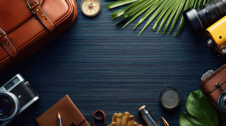A collection of vintage travel items including a leather bag, camera, compass, and binoculars, laid out on a dark wooden background with tropical leaves.